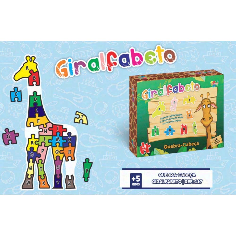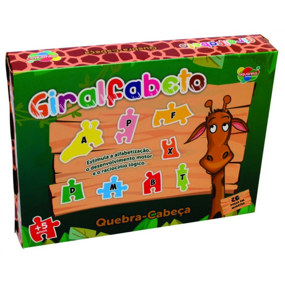 GIRALFABETO - QUEBRA-CABEÇA DE ALFABETO. A partir de 5 anos. Com 26 peças. Quebra-cabeça em formato de girafa com as peças na sequência do alfabeto. Material: madeira. Acondicionado em caixa de papelão. Marca Aquarela