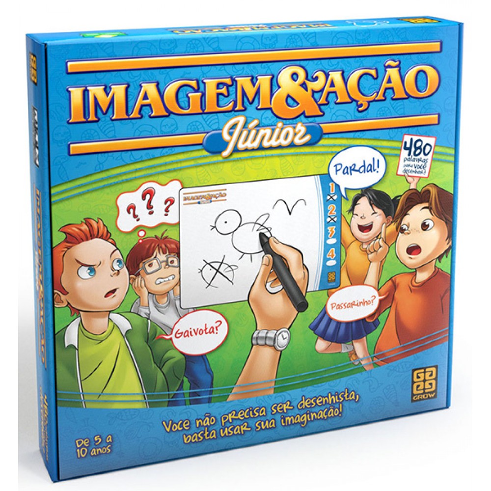 IMAGEM & AÇÃO Jr. Faixa etária: 5 a 10 anos. Participantes: 4 ou mais. São 480 palavras para desenhar. A equipe só pode passar para a segunda palavra se acertar o desenho da primeira, e assim por diante. Componentes: 120 cartas, 1 ampulheta, 2 quadros plastificados, 3 gizes de cera, 1 apagador de tecido, 1 regra. Material: cartonado e plástico. Acondicionado em caixa de papelão (30x31x5,2 cm). Marca Grow