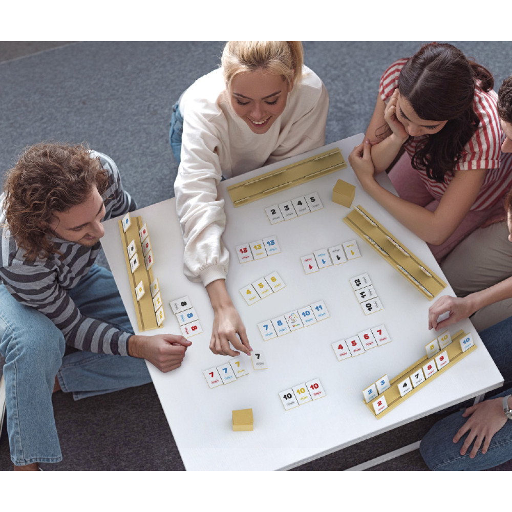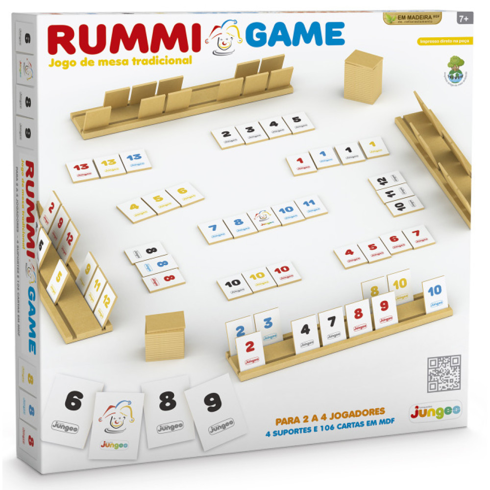 RUMMI GAME. A partir de 7 anos. Jogo de mesa tradicional, com cartas e suportes em madeira de MDF. Jogo para 2 a 4 jogadores, com manual de instrução na caixa. Impressão das cartas feita diretamente na madeira. Material: madeira MDF. Acondicionado em caixa de papelão. Marca Junges