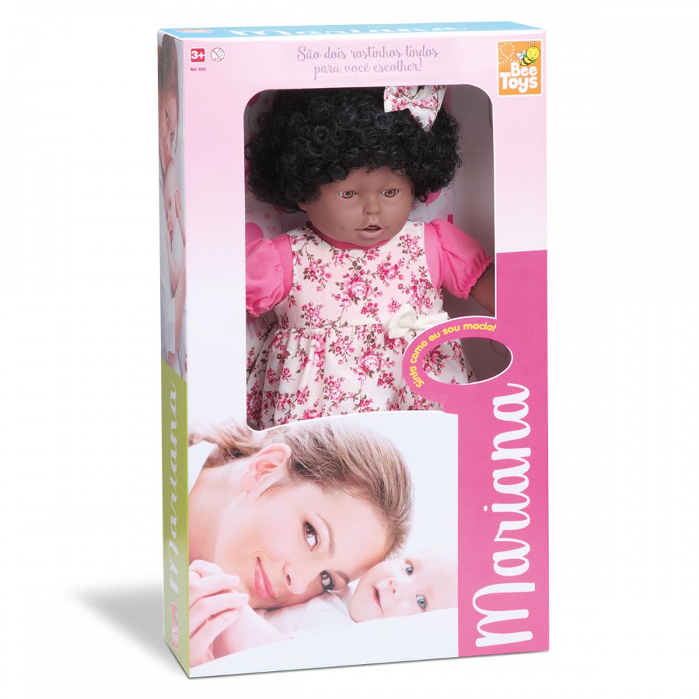 Produzida pela Rotobrinq, a Mariana possui cabelos implantados que permitem ser penteados, além de vir enfeitada com uma linda tiara e vestido. Seu acabamento em vinil e tecido a torna macia e gostosa de abraçar, sendo a companhia perfeita para todas as horas.